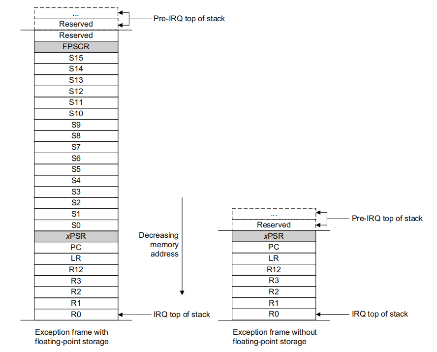 异常发生时,硬件自动压栈,异常栈帧结构如下: