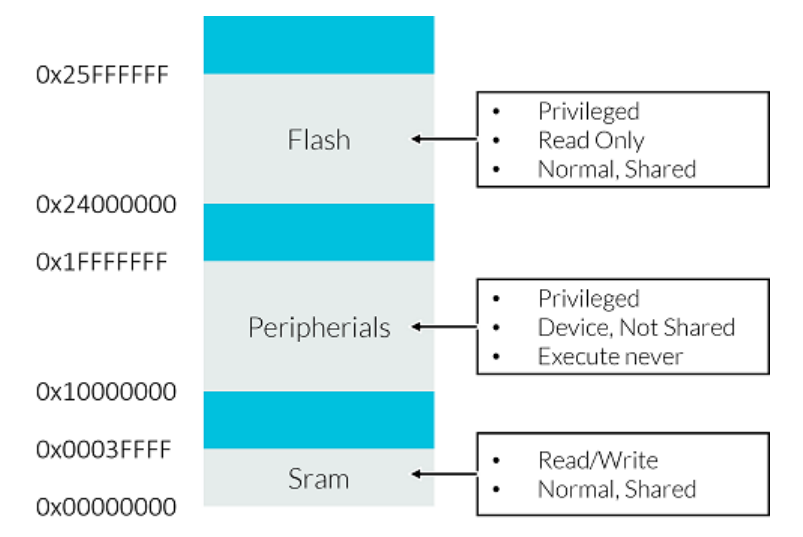 系统的内存映射可以被划分为多个区域。每个区域都可以具有不同的内存属性,例如:
