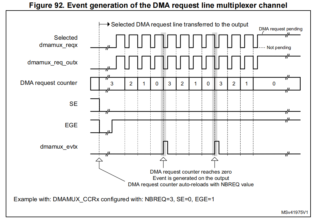 备注:对于DMAMUX_CCR 寄存器中的 NBREQ,当使能了同步模式,NBREQ 影响发生同步事件后可以传递的dma请求数;当使能了事件生成,NBREQ 影响几次DMA触发产生一个事件。