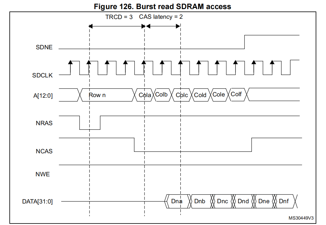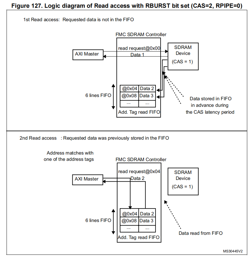 FMC SDRAM 控制器通过读 FIFO 和 RBURST 预取机制,把 CAS 延迟隐藏起来,提高突发读性能。
