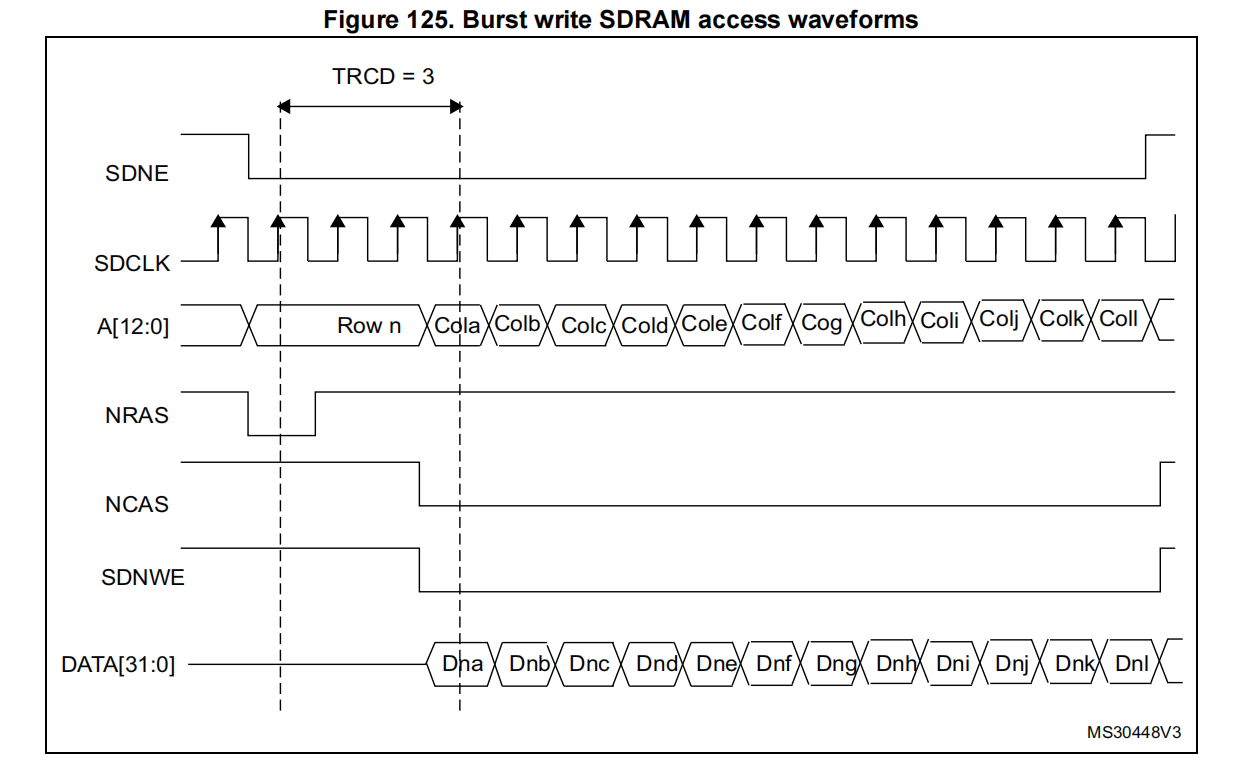 - 时序:控制器只发一次写命令,SDRAM 芯片自动在后续时钟周期里接收连续的数据字。地址自动递增(顺序或交错)。