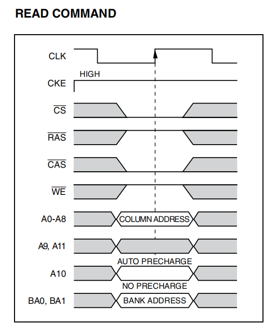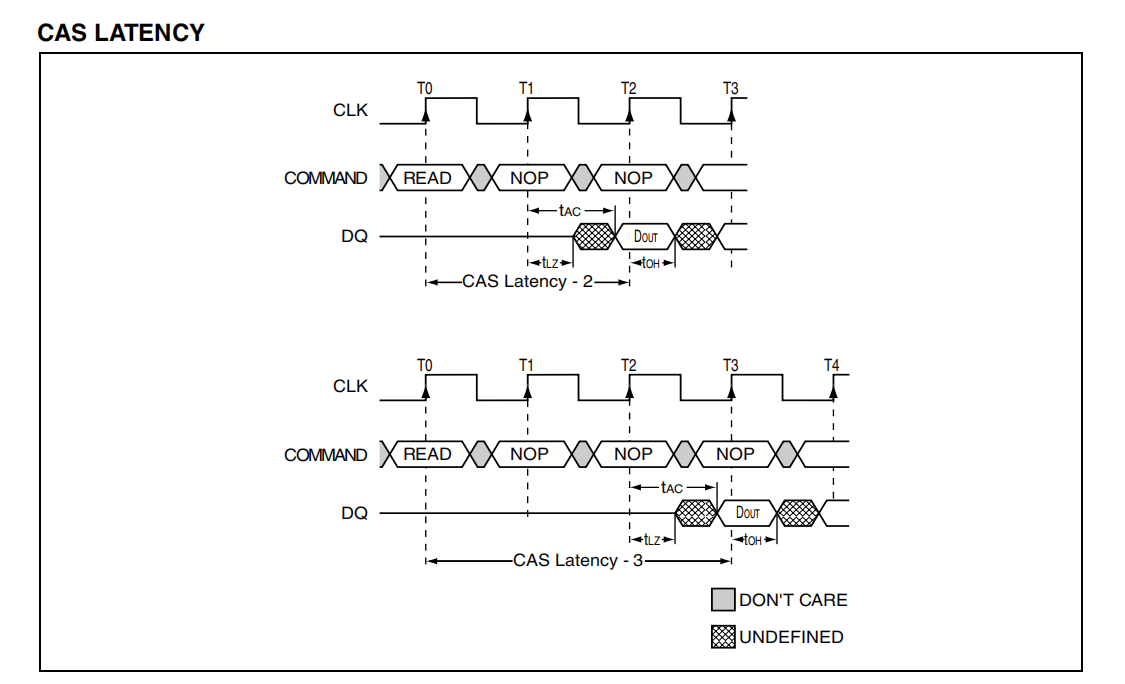 - Column Address Strobe Latency :指的是:当控制器发出 READ 命令并给出列地址后,SDRAM 需要等待多少个时钟周期才能把数据有效输出到总线上。