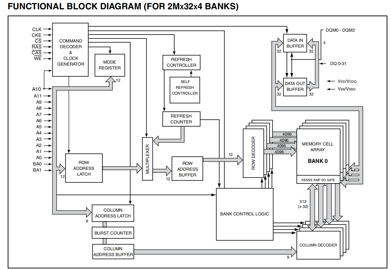 容量:256Mb = 2M × 32 位 × 4 Bank