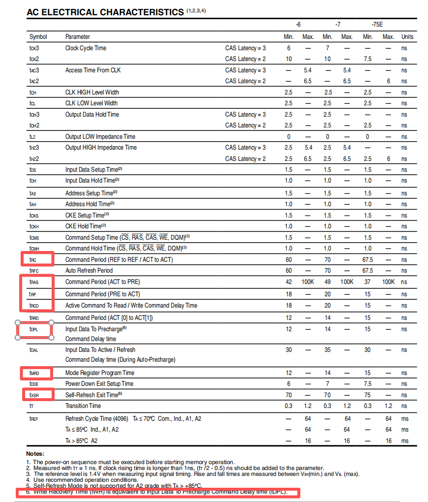 Clk Cycle Time(时钟周期):SDRAM 在当前速度等级(-6)、某个 CAS Latency 设置下,要求的 最小时钟周期。这是芯片内部完成一次操作所需的最短绝对时间。